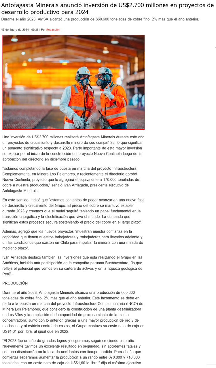 Antofagasta Minerals proyecta inversiones de 2.700 millones de dólares durante el 2024 - (El Mercurio de Antofagasta)