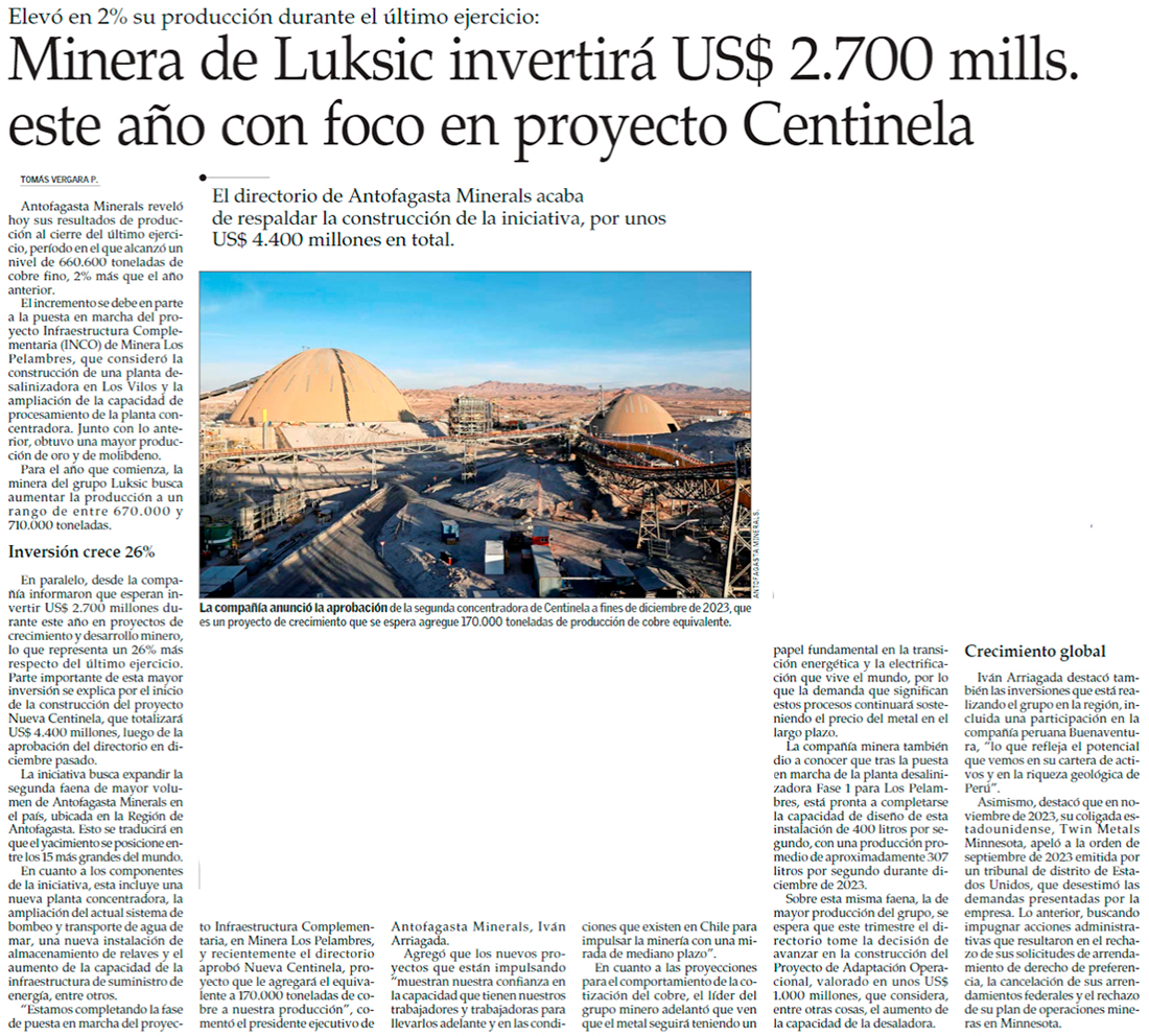Antofagasta Minerals proyecta inversiones de 2.700 millones de dólares durante el 2024 - (El Mercurio de Antofagasta)