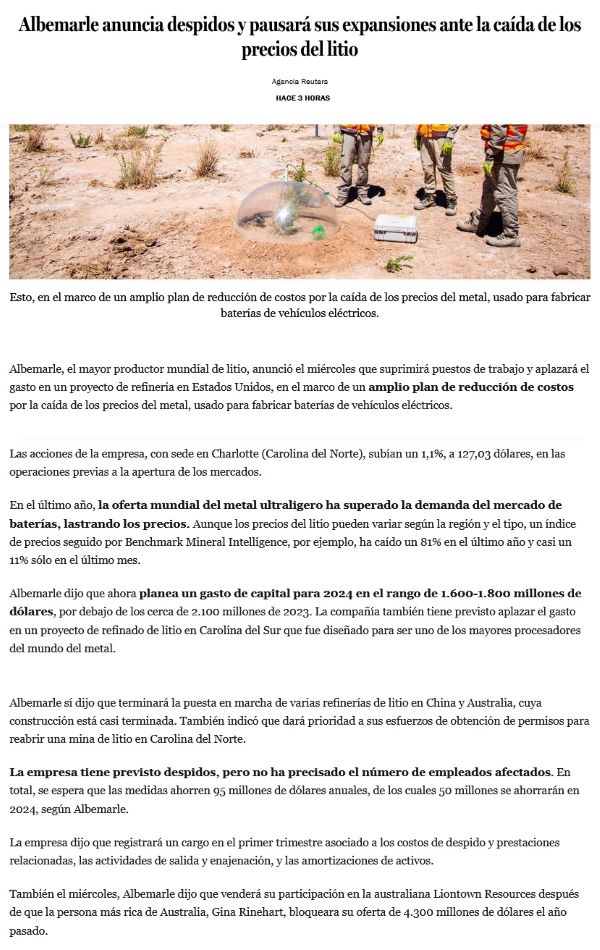 Albemarle anuncia despidos y pausará sus expansiones ante la caída de los precios del litio - (Pulso)