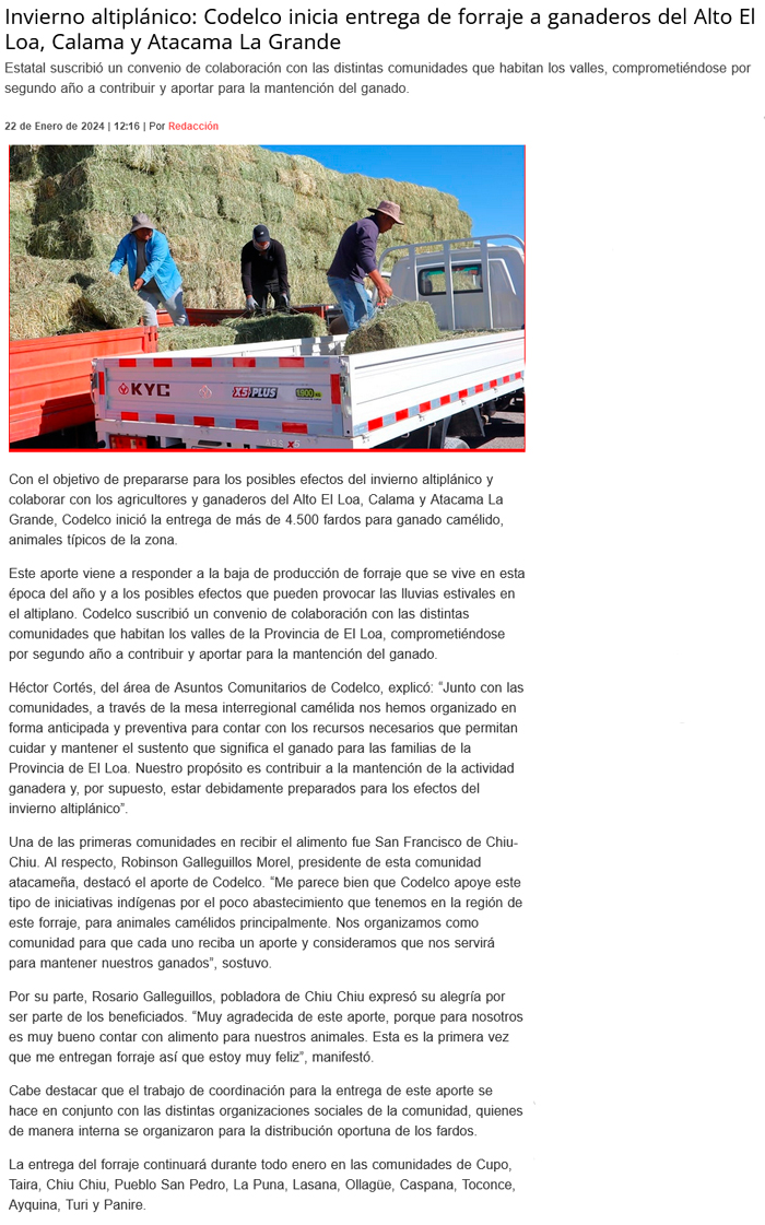 Codelco inicia entrega de fardos a ganaderos de Alto El Loa, Calama y Atacama La Grande - (El Mercurio de Calama)