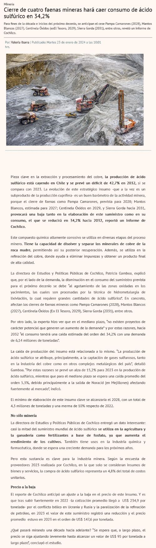 Cierre de cuatro faenas mineras hará caer consumo de ácido sulfúrico en 34,2% - (Diario Financiero)