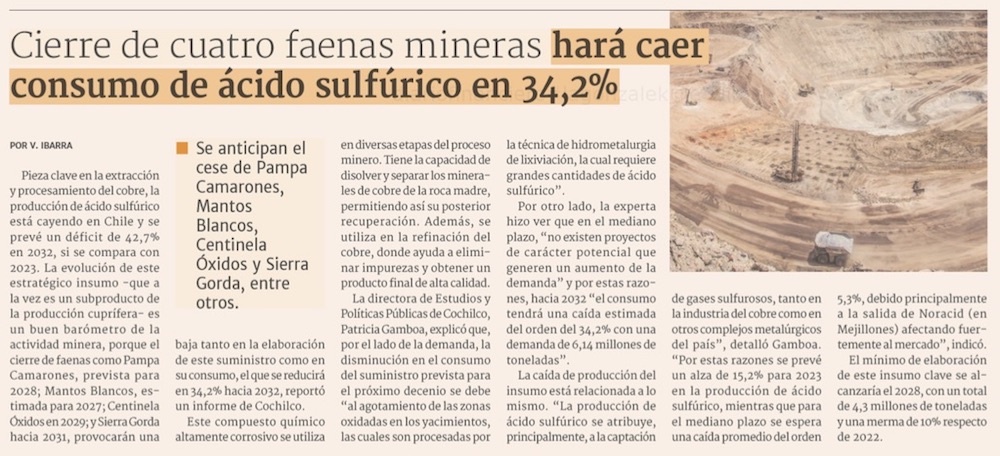 Cierre de cuatro faenas mineras hará caer consumo de ácido sulfúrico en 34,2% - (DF Online)