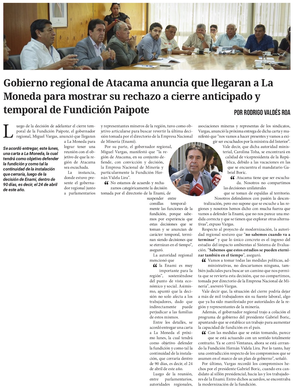 Autoridades y parlamentarios de Atacama piden revertir el cierre anticipado de fundición de Copiapó - (El Mercurio de Santiago)
