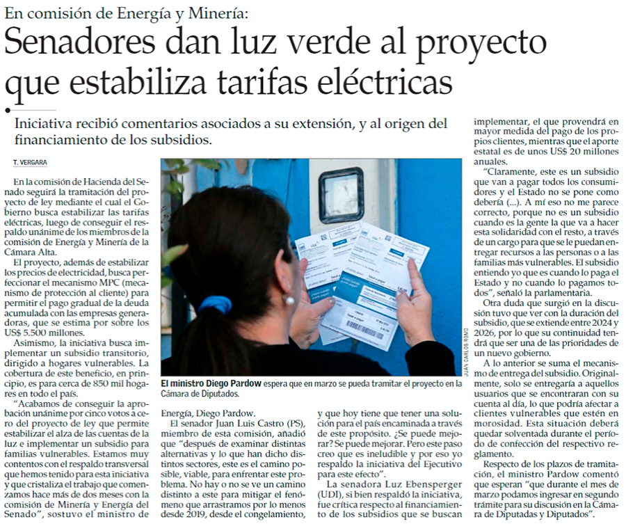 Senadores aprueban proyecto de estabilización de tarifas eléctricas y avanza a comisión de Hacienda - (Diario Financiero)