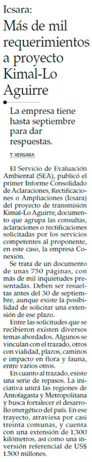 Kimal-Lo Aguirre: SEA publica primer informe con comentarios de servicios a la megalínea - (Diario Financiero)