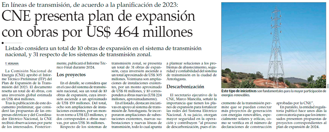 CNE propone obras por US$ 464 millones para expandir transmisión eléctrica - (Diario Financiero)