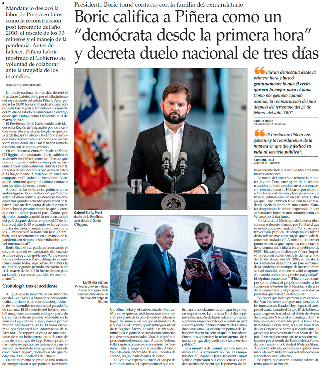El expresidente Sebastián Piñera muere al capotar su helicóptero en el lago Ranco: no pudo abrir su cinturón de seguridad - (El Mercurio de Santiago)