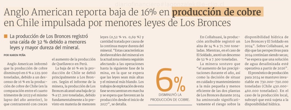 Producción de Los Bronces cae 20% y Anglo condiciona 2024 a disponibilidad hídrica - (El Mercurio de Santiago)