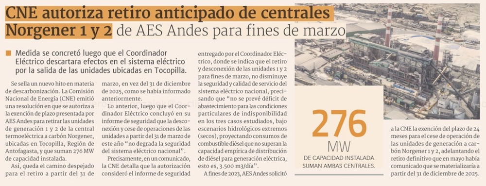 CNE aprueba adelantar el retiro de centrales eléctricas a carbón por 276 MW - (El Mercurio de Santiago)