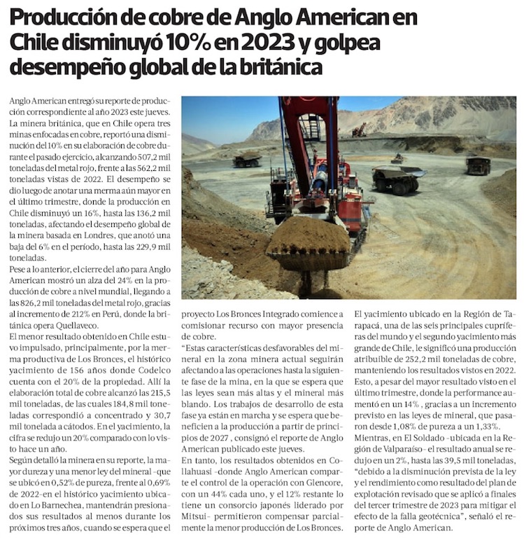 Producción de Los Bronces cae 20% y Anglo condiciona 2024 a disponibilidad hídrica - (El Mercurio de Santiago)