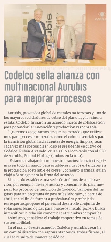 Codelco anuncia acuerdo con fundición alemana - (El Mercurio de Santiago)