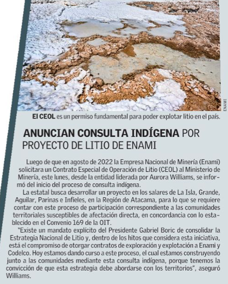 Minería inicia consulta indígena previa a entrega de contrato a Enami para explotar litio en los Cinco Salares - (DF Online)