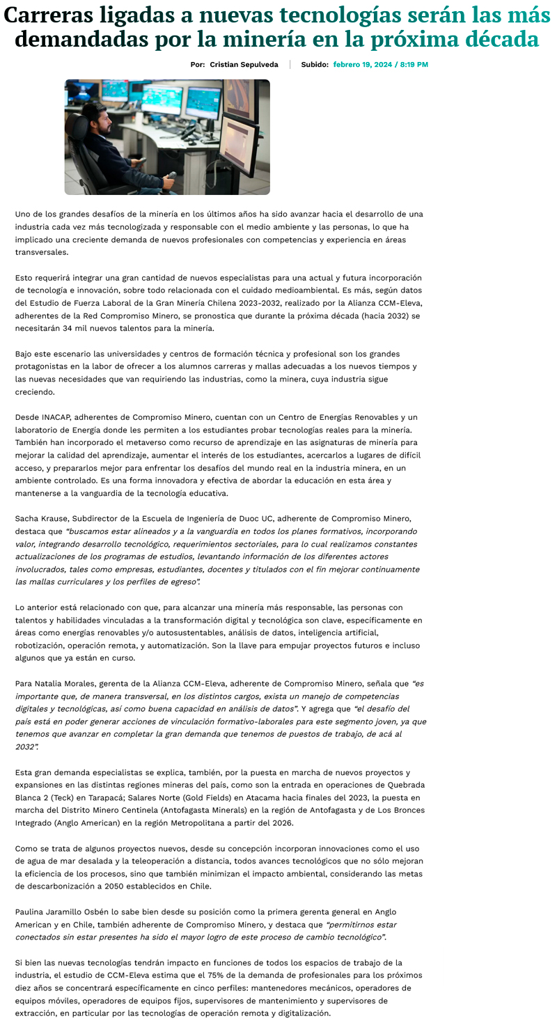 Carreras ligadas a nuevas tecnologías serán las más demandadas por la minería en la próxima década - (presslatam.cl)