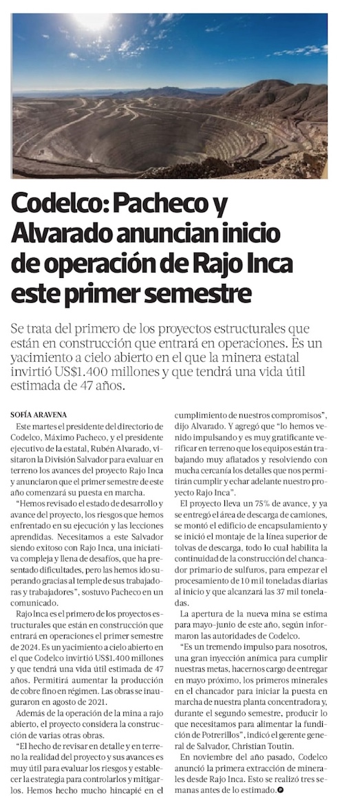 Codelco pondrá en marcha Rajo Inca en el primer semestre de 2024: lleva 70% de avance - (Diario Financiero)