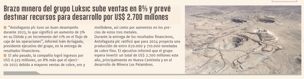 Antofagasta plc logró ingresos por US$6.325 millones durante 2023 - (El Mercurio de Antofagasta)