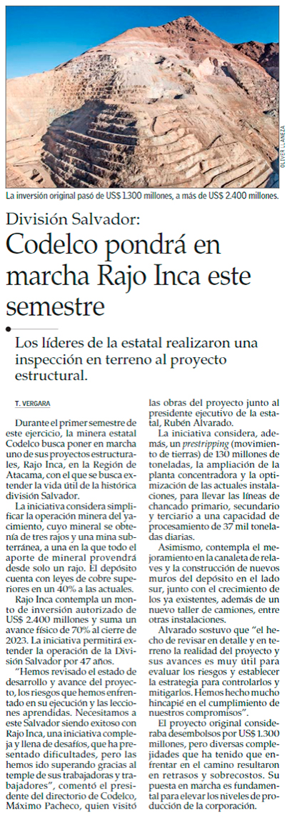Codelco pondrá en marcha Rajo Inca en el primer semestre de 2024: lleva 70% de avance - (Diario Financiero)