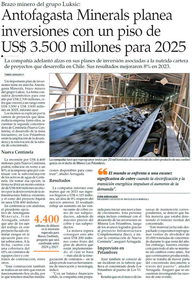 Antofagasta plc logró ingresos por US$6.325 millones durante 2023 - (El Mercurio de Antofagasta)