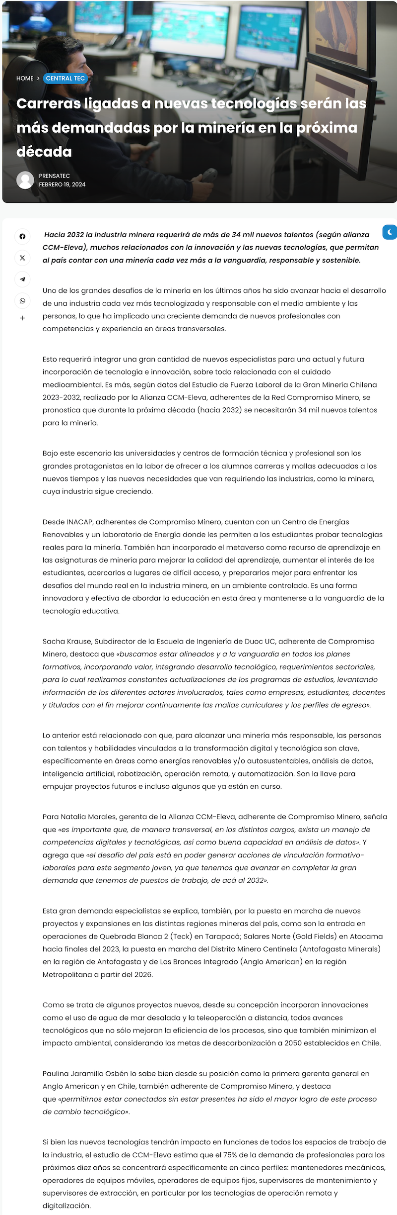 Carreras ligadas a nuevas tecnologías serán las más demandadas por la minería en la próxima década - (presslatam.cl)