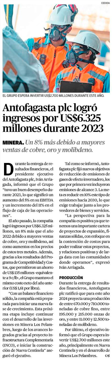 Antofagasta Minerals planea inversiones con un piso de US$ 3.500 millones para 2025 - (El Mercurio de Santiago)