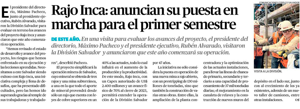 Codelco pondrá en marcha Rajo Inca este semestre - (El Mercurio de Santiago)