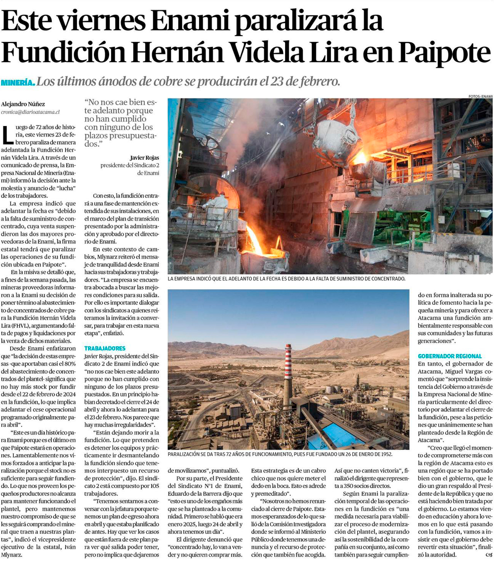 Fin de una era: Enami suspende pagos a proveedores y detendrá la fundición Paipote - (El Mercurio de Santiago)