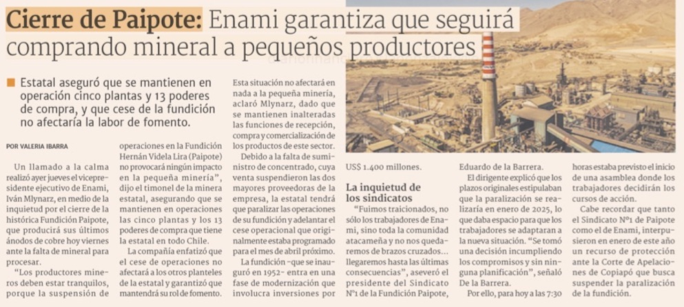 Enami garantiza a pequeños mineros que seguirá comprando sus productos - (El Diario de Atacama)
