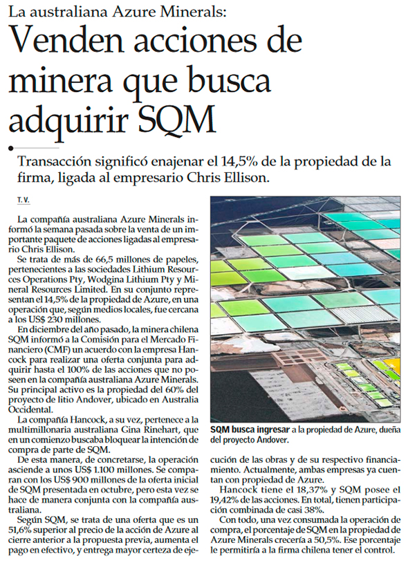 Millonario neozelandés vende 66,5 millones de acciones de Azure ad portas de oferta de SQM-Hancock - (Diario Financiero)