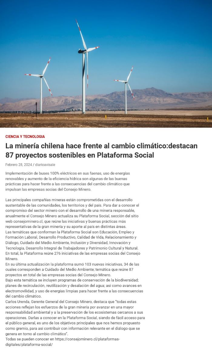 La minería chilena hace frente al cambio climático: destacan 87 proyectos sostenibles en Plataforma Social - (regionesnoticias.cl)