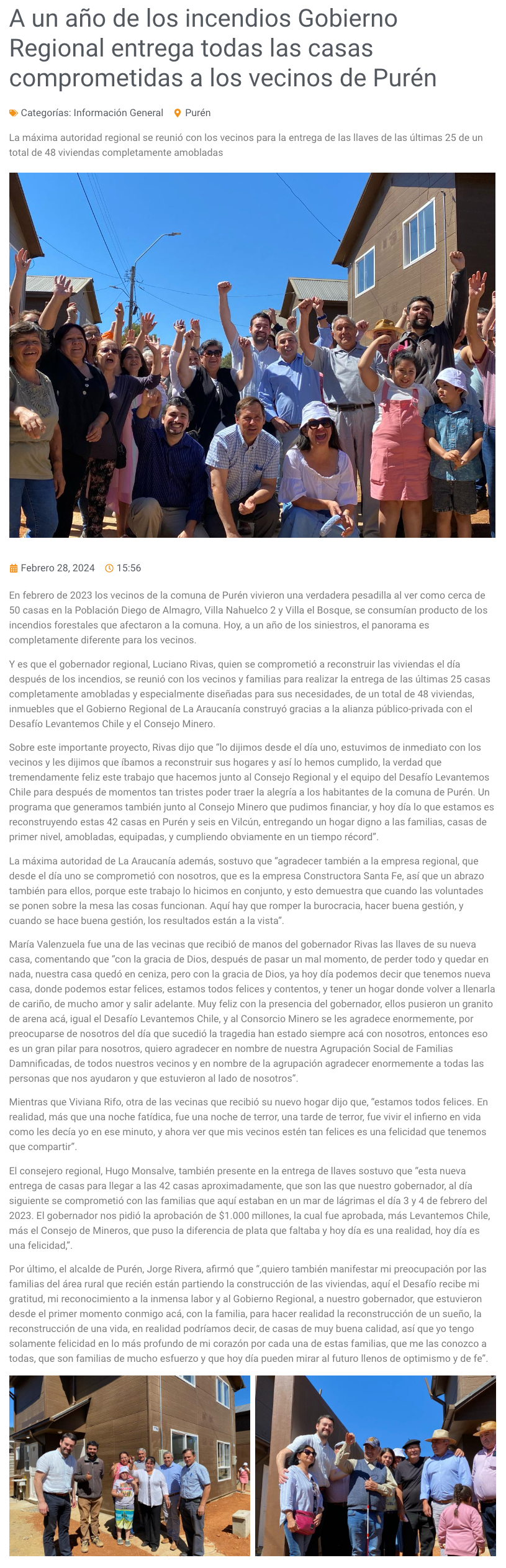 A un año de los incendios Gobierno Regional entrega la totalidad de las casas comprometidas a los vecinos de Purén - (araucanianoticias.cl)