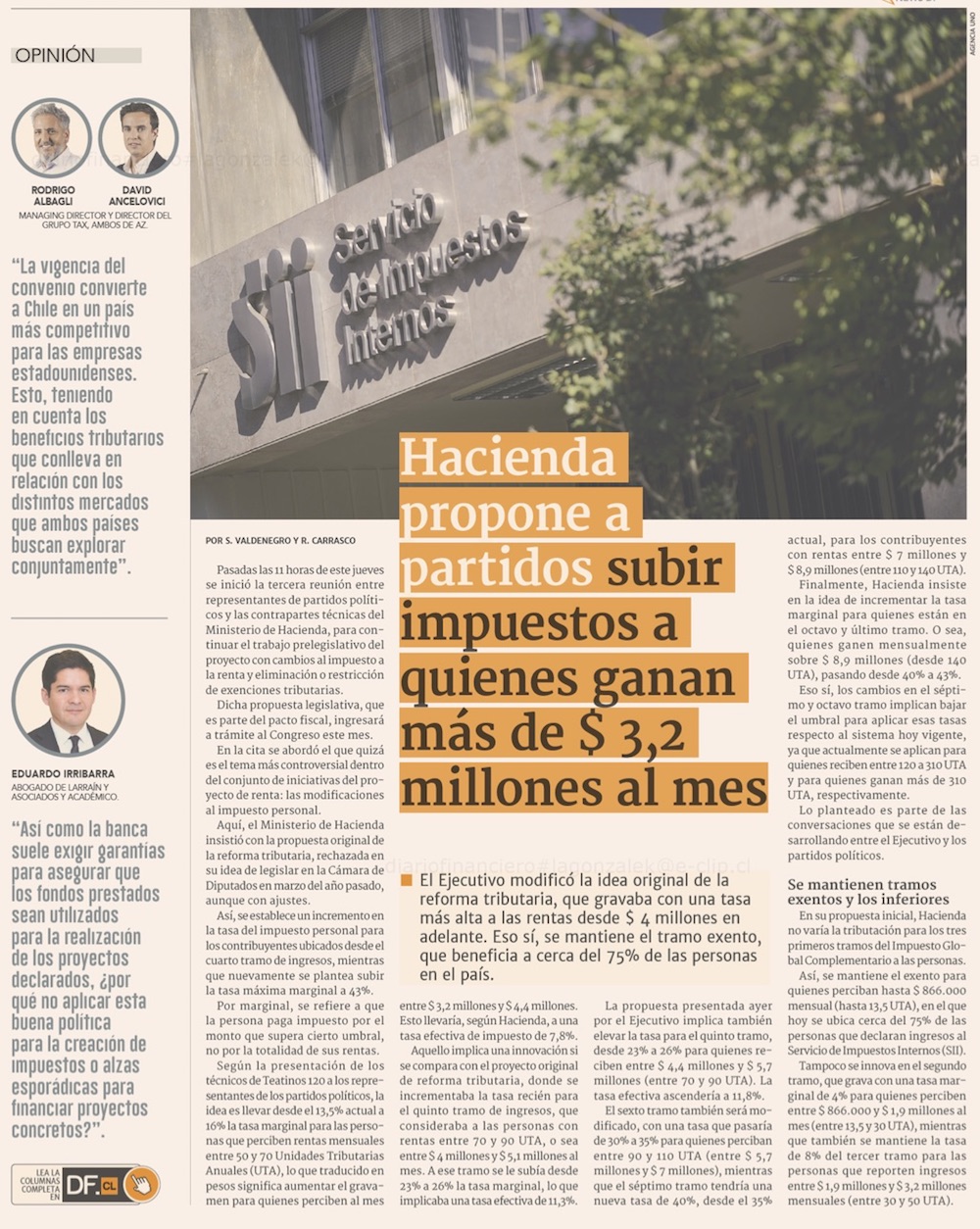 Hacienda propone subir los impuestos de las personas con ingresos sobre $3,2 millones - (El Mercurio de Santiago)