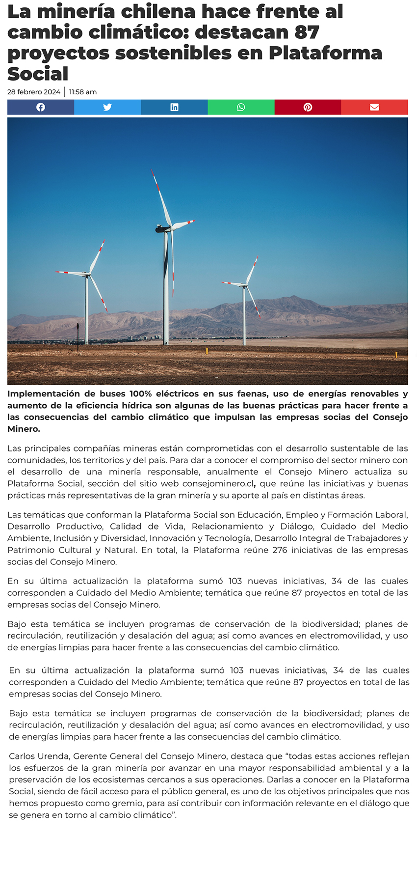 Consejo Minero busca con 87 proyectos sostenibles cuidar el Medio Ambiente - (madero.cl)