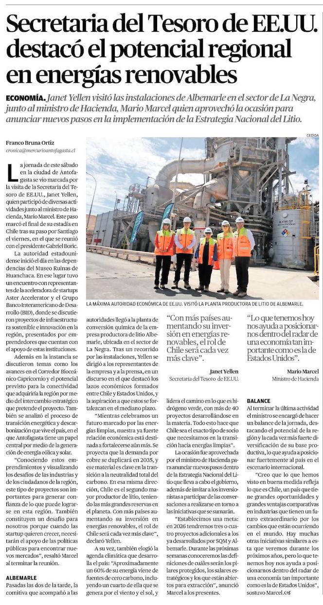 Secretaria del Tesoro de los Estados Unidos culmina viaje a Chile con visita a Antofagasta - (El Mercurio de Calama)