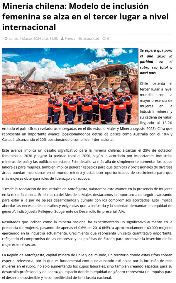 Minería Chilena: Modelo de inclusión femenina se alza en el tercer lugar - (mch.cl)