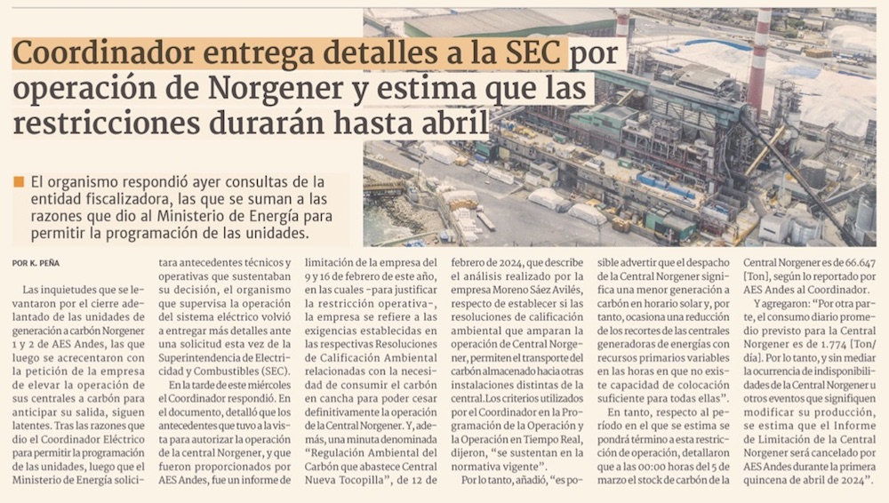 SEC pide antecedentes por operación de termoeléctrica Norgener al Coordinador Eléctrico - (El Mercurio de Santiago)
