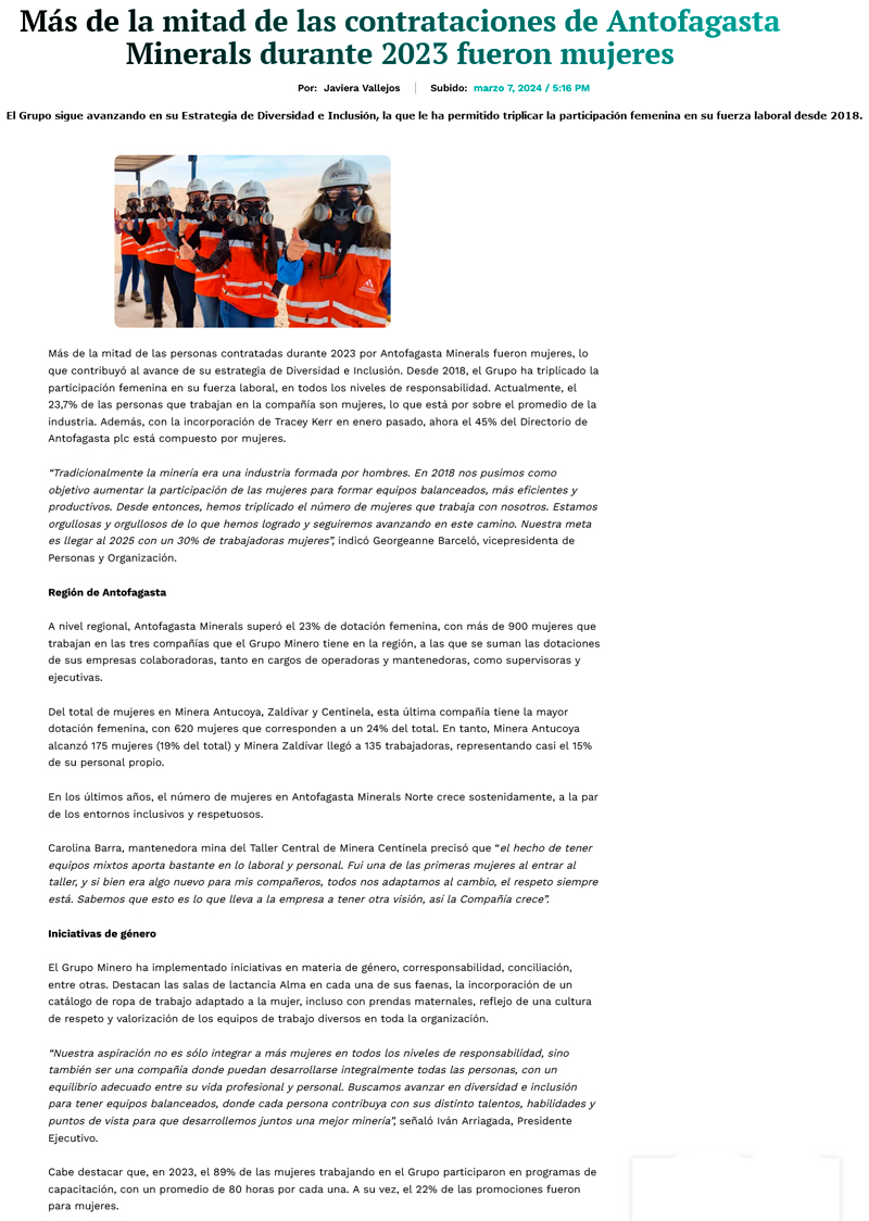 Durante el 2023 más de la mitad de las contrataciones de AMSA fueron mujeres - (El Mercurio de Calama)
