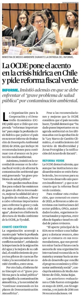 OCDE recomienda a Chile una reforma integral de la asignación de agua e introducir instrumentos económicos para su gestión - (Diario Financiero)