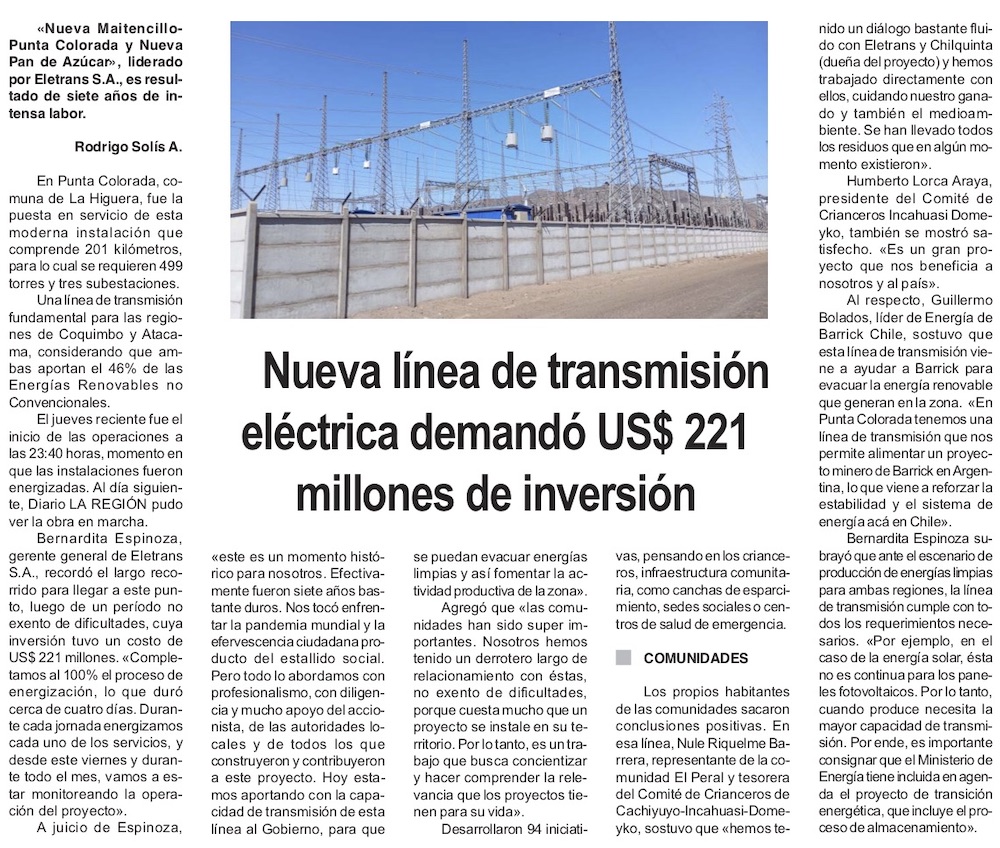 Filial de Chilquinta pone en operación proyecto por US$ 211 millones - (El Mercurio de Santiago)
