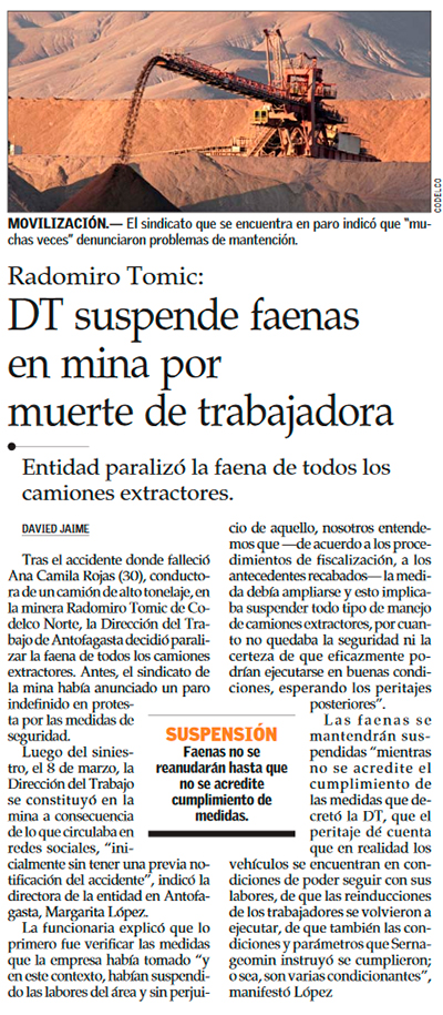 Suspenden operaciones de extracción en Radomiro Tomic tras fatal accidente - (El Mercurio de Calama)