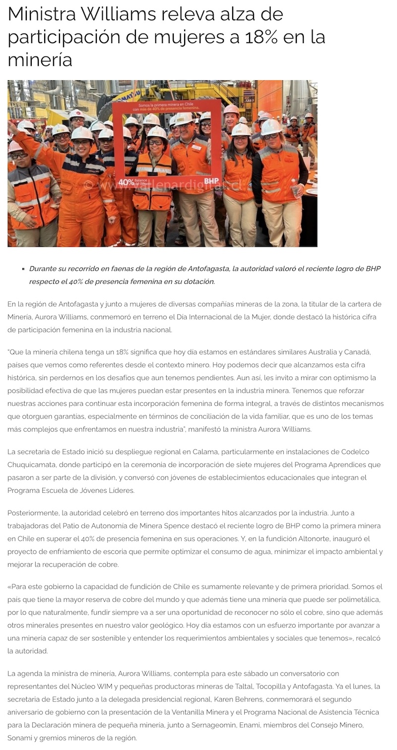 Ministra Williams releva alza de participación de mujeres a 18% en la minería - (presslatam.cl)
