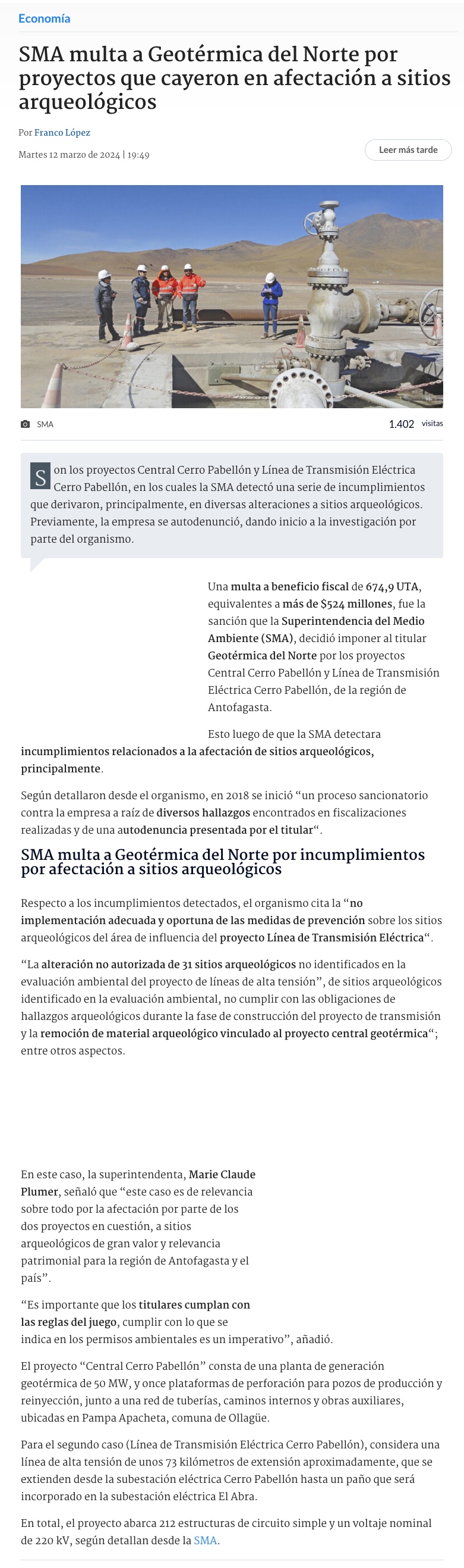 Multan a Cerro Pabellón por proyectos de central y línea de transmisión - (El Mercurio de Antofagasta)