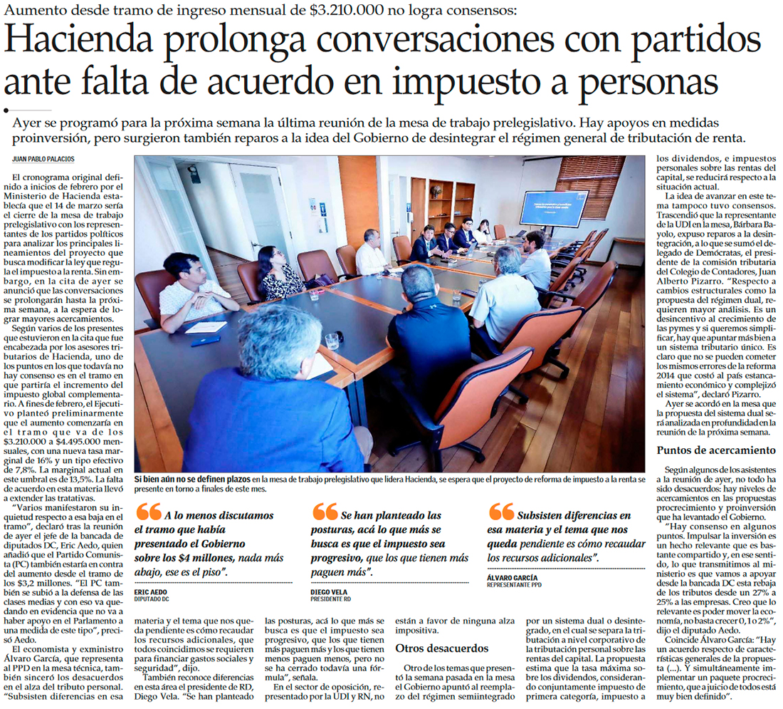 Hacienda extiende negociaciones y pierde apoyo alza de impuesto personal desde $3,2 millones - (Diario Financiero)