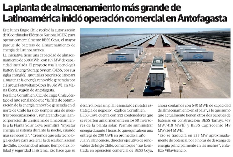 Entra en operación comercial el mayor parque de baterías de la región - (El Mercurio de Santiago)