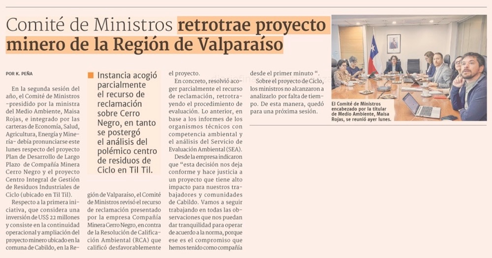 Comité de Ministros admite recurso y revierte rechazo a Cerro Negro - (El Mercurio de Santiago)