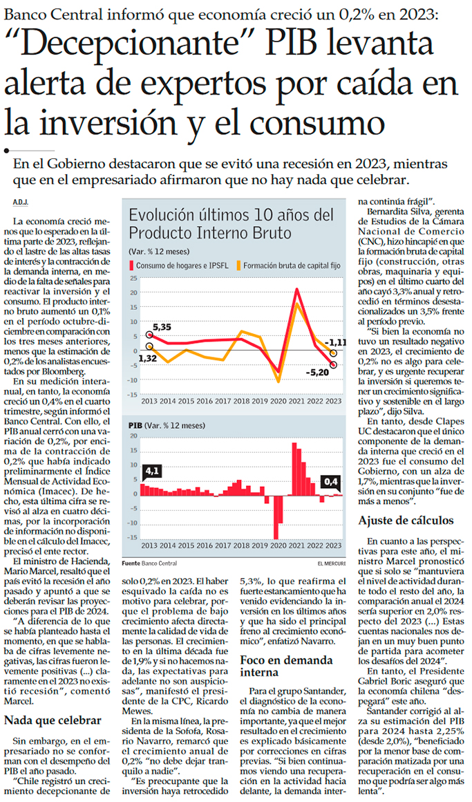 Chile esquiva la recesión en 2023 y resultado afianza expectativas de crecimiento sobre 2% este año - (Diario Financiero)