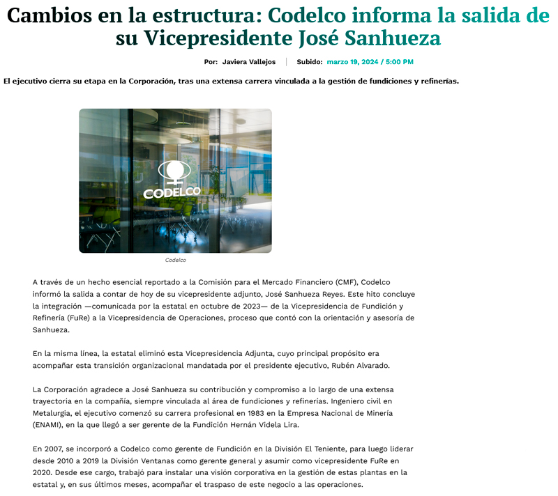 Codelco anuncia fin de cambios organizacionales - (Pulso)