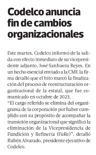 Cambios en la estructura: Codelco informa la salida de su Vicepresidente José Sanhueza - (madero.cl)