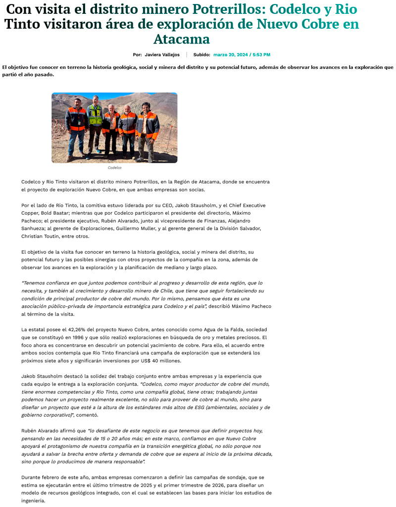 Proyecto Nuevo Cobre da nuevo paso con visita de gigante mundial de la minería - (El Diario de Atacama)