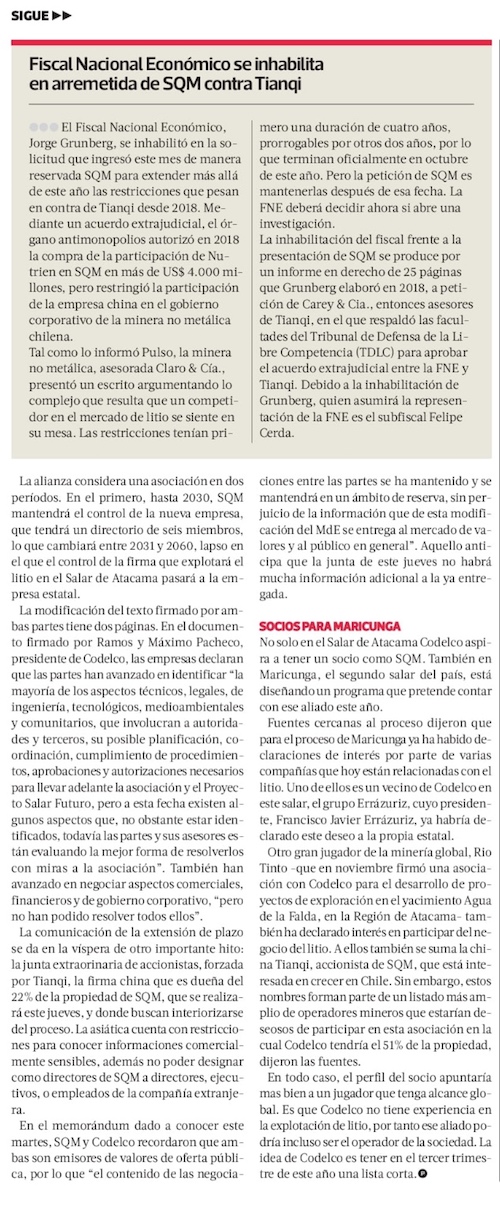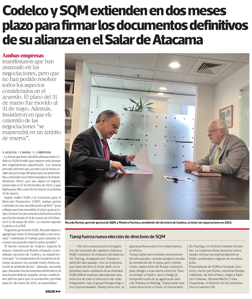 Acuerdo definitivo entre Codelco y SQM se firmaría el 31 de mayo - (El Mercurio de Calama)