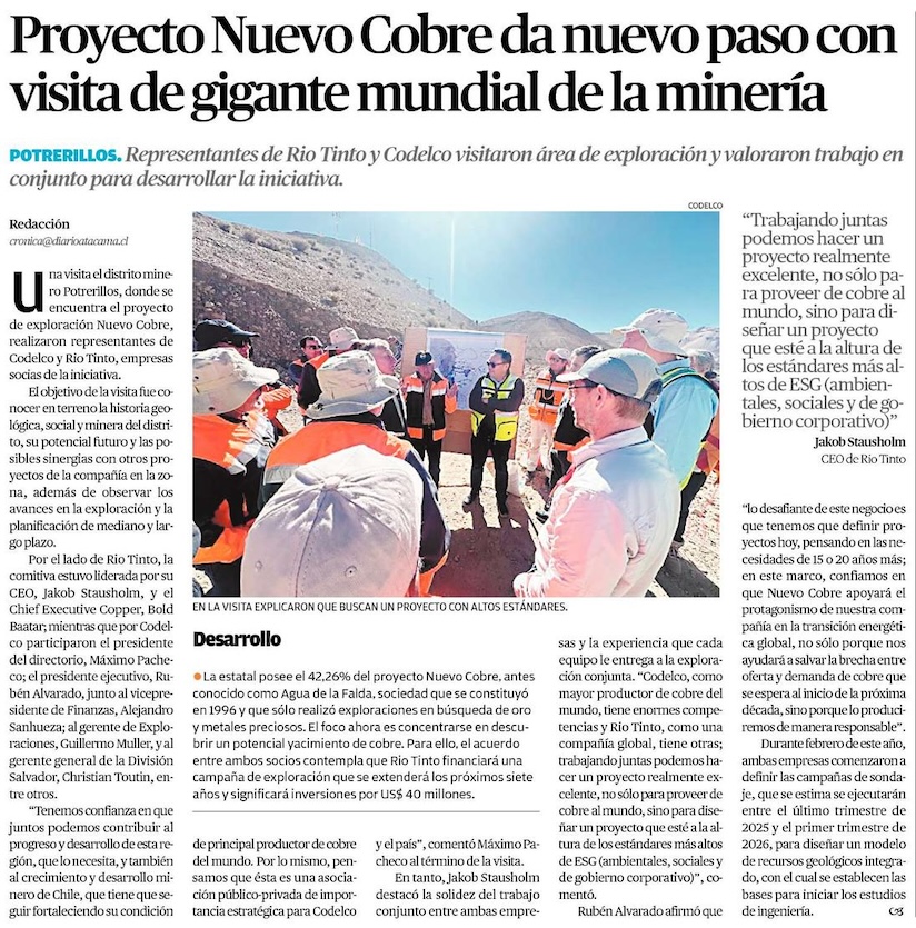 Con visita el distrito minero Potrerillos: Codelco y Rio Tinto visitaron área de exploración de Nuevo Cobre en Atacama - (madero.cl)