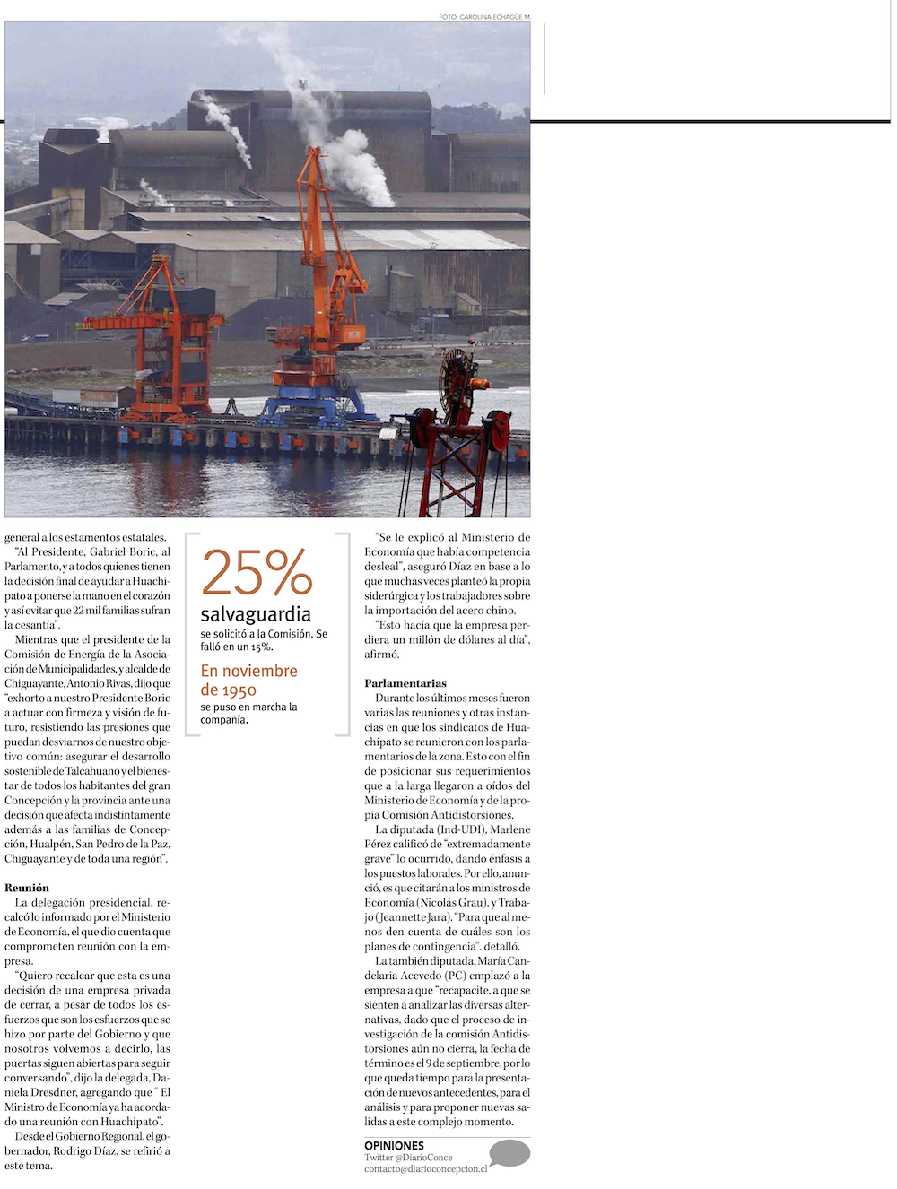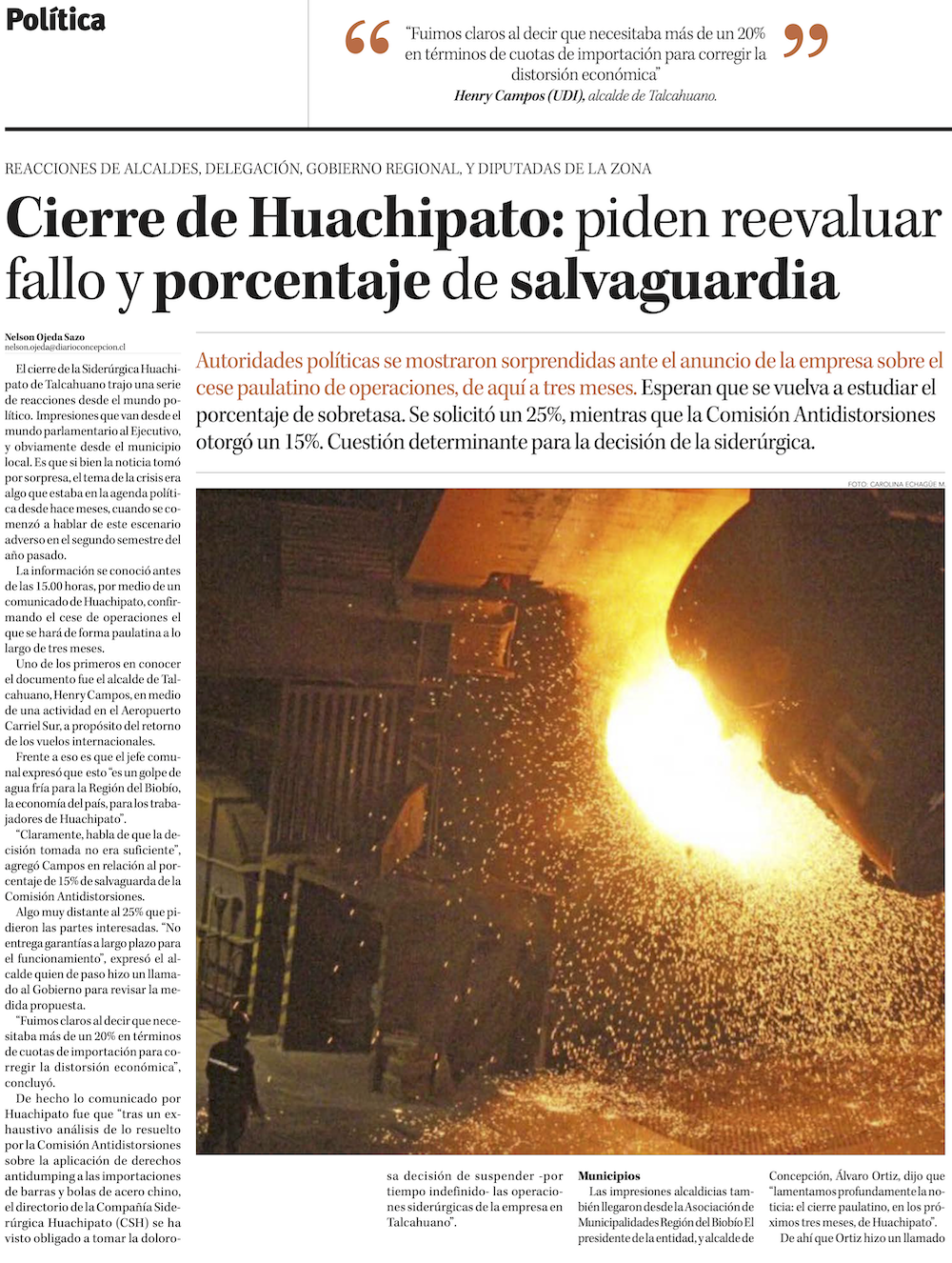 Siderúrgica Huachipato suspende indefinidamente su operación por considerar insuficientes las sobretasas a las importaciones chinas - (Diario Financiero)